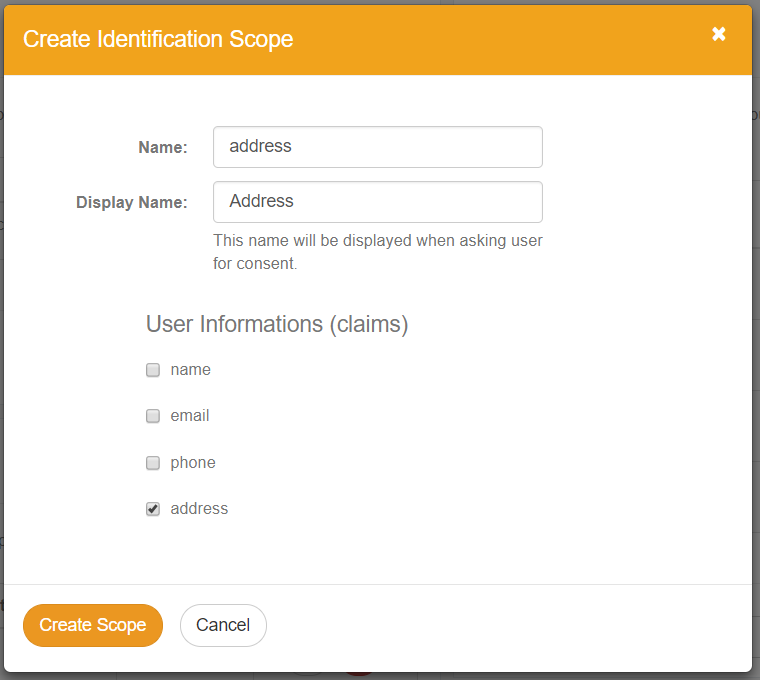 An Identity Scope has a name, display name and a set of claims. GrantID (HML) provides a couple of default scopes that include basic user claims: